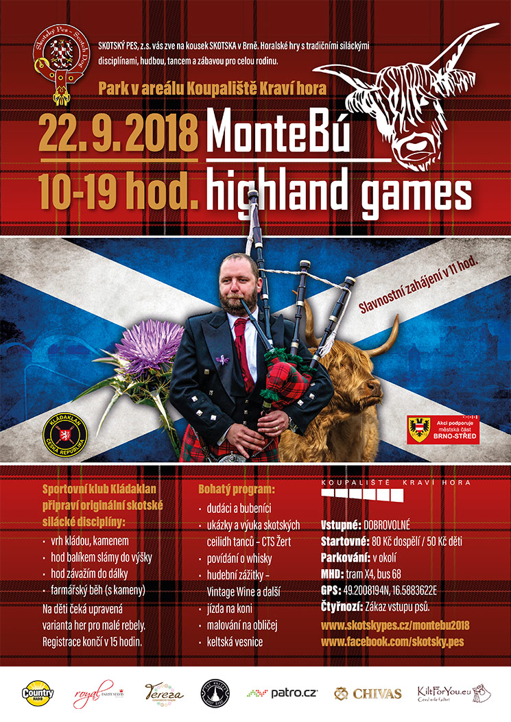 V sobotu 22. 9. v areálu koupaliště na Kraví hoře v Brně se uskuteční již potřetí MonteBú Highland Games – horalské hry s tradičními siláckými disciplínami, hudbou, tancem a zábavou pro celou rodinu. Všichni jsou srdečně zváni!